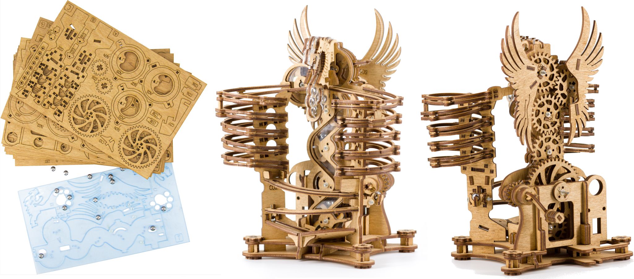 Le Marble Run Dragon est une créature mécanique en bois qui, une fois assemblée, devient un labyrinthe de billes captivant. Le kit comprend 260 pièces en bois de haute qualité, découpées avec précision au laser, et 15 billes métalliques. L'assemblage, estimé à environ 6 heures, ne nécessite ni colle ni outils supplémentaires, offrant une expérience de bricolage pure et satisfaisante. Une fois monté, le mécanisme permet de transporter automatiquement les billes vers le haut grâce à une manivelle, puis de les diriger sur deux parcours distincts via un interrupteur à bascule, créant un spectacle hypnotisant de mouvement perpétuel.