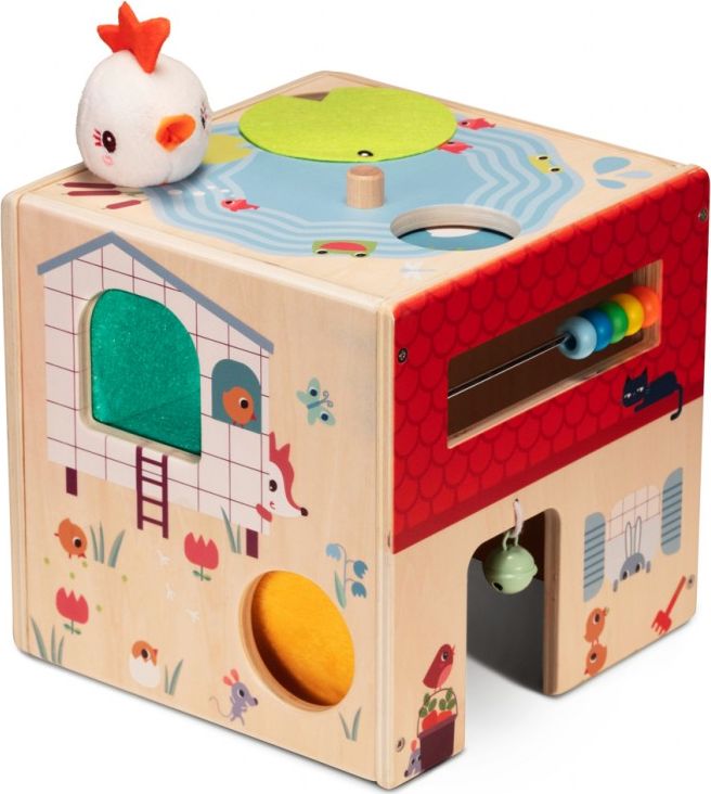 Avec ce cube d’activités en bois sur le thème de la ferme, c’est comme si vous y étiez ! Votre petit bout pourra suivre Paulette la poulette dans ses folles aventures à la ferme: plonger dans l’étang, explorer les faces cachées du cube, se reposer dans son poulailler et encore plein d’autres activités amusantes! Les sens, les petits doigts, le cerveau et l'imagination des petits sont défiés et stimulés grâce à un boulier, un miroir, des illustrations et plus encore.