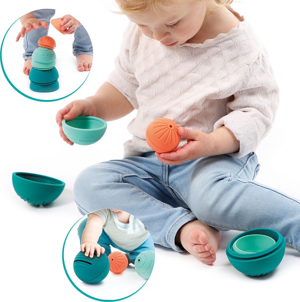 Le concept est simple mais ingénieux: trois balles de tailles différentes s'emboîtent les unes dans les autres, comme des poupées russes. Bébé peut les manipuler, les empiler, les faire rouler, ou même les utiliser dans le bain grâce à leur conception en silicone et leurs trous permettant de jouer avec l'eau. Un jeu polyvalent qui évolue avec l'enfant!