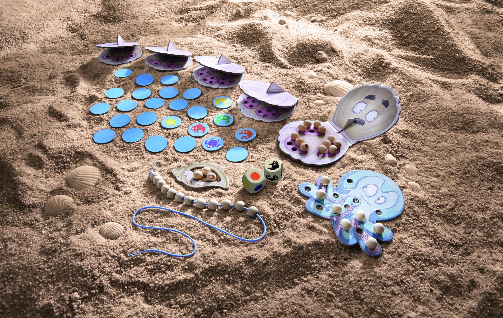 C’est la fiesta des perles sur la barrière de corail et une famille de coquillages offre ses plus belles perles pour fabriquer des guirlandes! Avec un peu de chance aux dés, les joueurs récupèrent des perles, qu’ils enfilent sur une cordelette. Mais attention à la pieuvre! Elle adore aussi les perles et les collectionne petit à petit pour décorer ses tentacules! Le joueur qui forme le plus long collier de perles gagnera la partie.