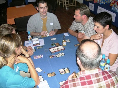 Le grand classique Citadelles, le jeu le plus populaire de Bruno Faidutti, est toujours mon préféré parmi les jeux de cartes. Une partie à 5 joueurs, avec Marie-Agnès, Boris, François, Frédéric et Pascal. |