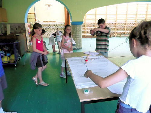 | Le crayon coopératif. A l'aide de fils tendus, les enfants pilotent un crayon et doivent parcourir un circuit ou réaliser un dessin imposé. | |