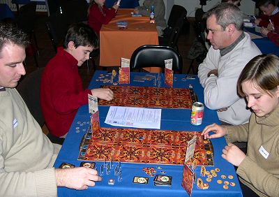 | Un tournoi géant de Dungeon Twister? Vous n'y êtes pas: c'est carrément le championnat du monde! Et sans rire, j'ai été surpris du niveau atteint par les fans de Dungeon Twister. C'était bien sûr en full frontal, avec toutes les salles et les personnages existants. Ca donnait parfois des conditions originales, un sacré challenge pour les participants. Bravo à Chris Boelinger, l'auteur du jeu, pour l'enthousiasme permanent dont il fait preuve et qui catalyse la bonne humeur de tous ceux qui l'entourent. | |