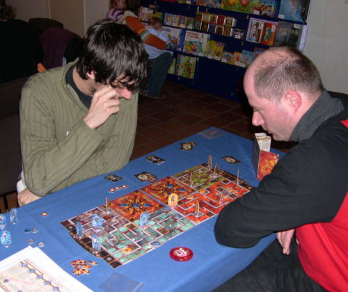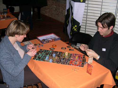 Dungeon Twister a connu un démarrage sur les chapeaux de roues, avec une journée exceptionnelle Jeux de NIM le 15 janvier 2005. Le succès se confirme chaque soir, où de nouveaux joueurs le découvrent. Nous attendons maintenant avec impatience que les figurines en 3D arrivent enfin en Belgique! Une partie à 2 joueurs, avec Catherine et Jean-Pierre. |
