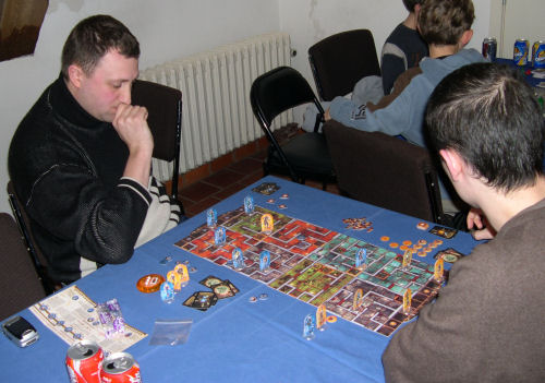 | La matinée commence par un tournoi de Dungeon Twister selon la formule "tradition", c'est-à-dire avec exclusivement la boîte de base du jeu. Maxime a choisi de participer au tournoi. Le niveau du tournoi est élevé, et il aura beaucoup de fil à retordre. | |
