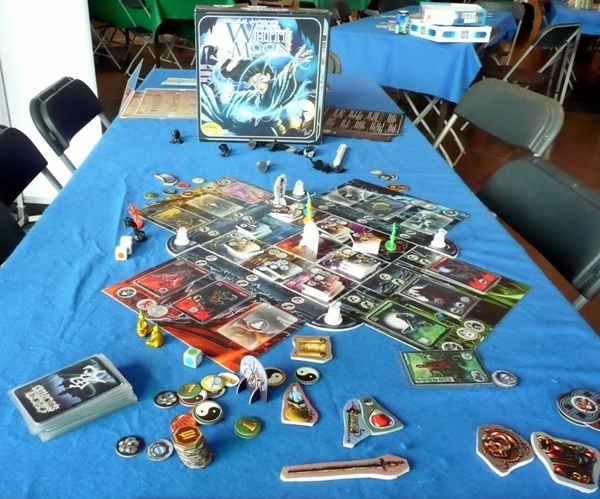 | Ghost stories. Voici une table impressionnante de 4 joueurs adultes et jeunes gens qui découvrent Ghost stories. Ils ont joué avec patience et passion, ont coopéré avec brio pour parvenir à bout du Wu-Feng, le "boss" des fantômes qu'il faut exorciser pour gagner la partie. La partie a duré près de 2h30, les joueurs ont "tout donné" et sont sortis très satisfaits de cette belle partie. Une victoire dès la première partie, c'est un exploit, chapeau! | |