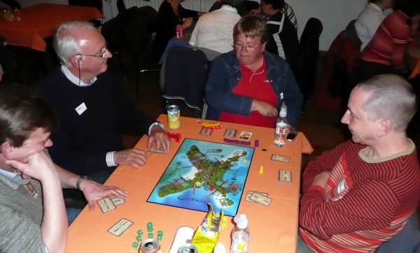 Philippe, grand habitué des soirées, en compagnie de Rino, Fabienne, Valérie et François découvrent Maka Bana. J'ai fait beaucoup d'éloges sur ce jeu qui les mérite amplement. Il a tourné en permanence, j'en ai expliqué les règles quatre ou cinq fois sur la soirée. Les avis sont unanimes, c'est un jeu à la fois beau, au thème paradisiaque, amusant, stratégique et bluffant. Pour la petite histoire de Maka Bana, j'ai été amusé de rencontrer des joueurs qui ont navigué sur le web et ont remarqué à la fois des avis très positifs et d'autres avis qualifiant le jeu de répétitif. Une fois les règles correctement expliquées et les parties jouées, je peux affirmer que tous les joueurs s'y sont beaucoup amusés, et que pas un seul n'a trouvé le jeu répétitif. Comme quoi il suffit probablement de bien expliquer le jeu, ou de bien l'appréhender pour y trouver un grand plaisir ludique. |