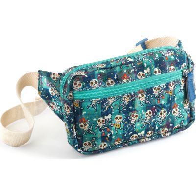 Un sac banane illustré sur le thème des squelettes avec une grande poche centrale et une petite poche sur le devant. L’enfant peut le porter en bandoulière ou à la taille en fonction de son style. > voir détail