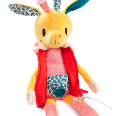 La girafe Zia adore les vêtements. Ouvre la tirette de sa veste, clique sa ceinture, noue ses chaussettes... Son bébé se cache dans sa pochette à bouton sur son ventre. > voir détail