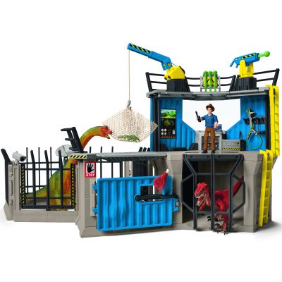 La grande station de recherche dino est le plus grand bâtiment de la collection Schleich. En plus de la centrale de commandement, la station est équipée d'une plate-forme d'observation avec un canon pivotant muni d'une flèche paralysante ainsi que d'une grue. Dans la partie inférieure de la station se trouve une salle dans laquelle les dinosaures qui viennent d'être capturés sont placés en quarantaine. Cette salle permet d'effectuer immédiatement les premiers examens. Les dinos peuvent ensuite rejoindre l'enclos à travers la trappe. Oh non ! Le Vélociraptor est sorti ! Maxx arrivera t-il à le capturer avec sa lance? Le set de jeu comporte de nombreux accessoires et 2 dinosaures super bien décorés. > voir détail