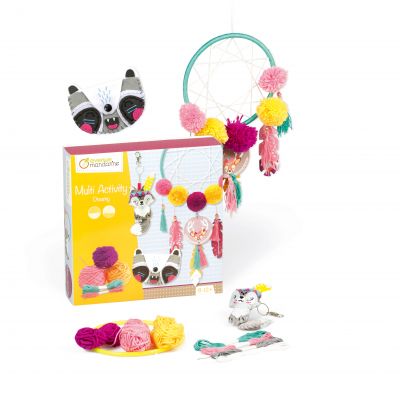 Trois activités dans ce coffret: un attrapes-rêve coloré et poétique avec des pompons à fabriquer, des perles à enfiler, du fil à enrouler; un masque à créer avec des bouts de laine et un porte clé à coudre. > voir détail
