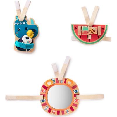 Ce set, constitué de 3 éléments indépendants, se fixe aisément au parc de bébé. Chaque panneau est composé de plusieurs matières et propose différentes activités. Le toucan se glisse dans les bras de Marius, les cubes permettent de former des paires sur la pastèque et le lion est un miroir. Un monde de nouvelles expériences s'ouvre à votre tout-petit. > voir détail