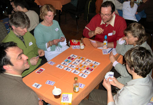 | Une partie de Maka Bana à 4 joueurs. Aurélie nous fait déjà des grands yeux en regardant l'objectif. Elle ne sait pas encore que son regard intense lui sera utile pour le concours Maka Bana plus tard dans la soirée (et plus loin dans le reportage). | |