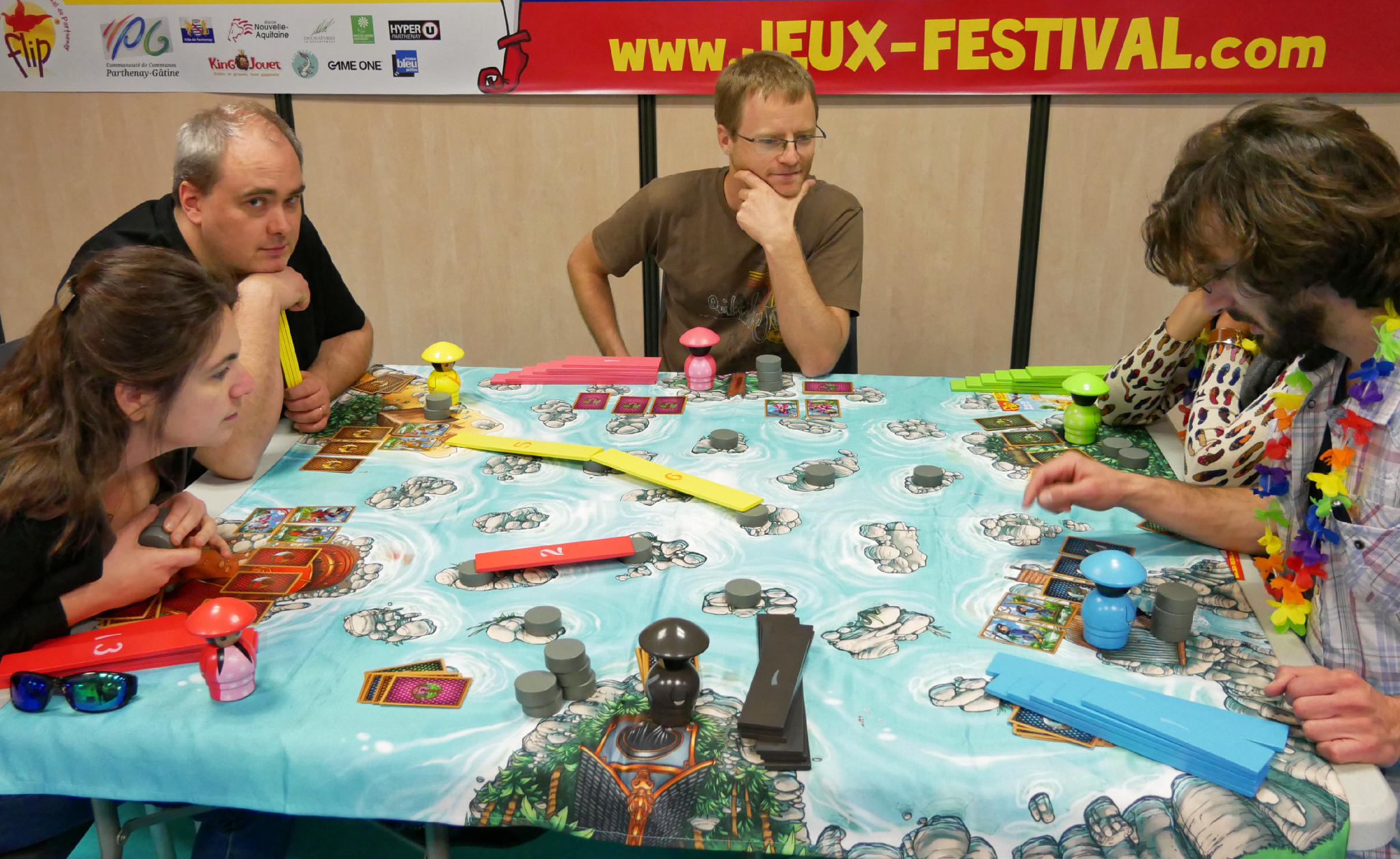Le jeu Tiki est une création de Nicolas Sato, que nous connaissons notamment pour avoir créé le jeu Lutèce que j'apprécie beaucoup. Le jeu prend un chemin inhabituel puisqu'il sera produit par Oz Editions (que vous ne connaissez certainement pas puisqu'il s'agit d'une première édition) à travers une campagne de financement participatif (crowdfunding, en anglais) sur Kickstarter. Suivez le lien pour y participer à la campagne. L'éditeur Oz a eu la bonne idée de faire une campagne Kickstarter amicale vis-à-vis des boutiques spécialisées. Les boutiques partenaires pourront aussi participer à la campagne pour proposer le jeu dans leur rayon, ce qui assurera la pérennité du jeu. Et les clients investisseurs de la campagne pourront aller retirer leur commande gratuitement dans ces mêmes boutiques partenaires. Jeux de NIM sera donc boutique partenaire pour le jeu Tiki, une première participation pour le magasin dans une campagne de crowdfunding. Pour revenir au jeu, Tiki est un jeu de réflexion pur jus. L'objectif est de récolter 4 ananas en réalisant des empilements de Tiki sur le plateau. A chaque tour de jeu, le joueur actif peut déposer un nouveau tiki, ou "semer" une colonne de tikis sur le plateau de jeu (le joueur prend la colonne et sème un tiki à la fois de case en case). Quand un joueur forme une pile de 3 tikis, il gagne autant d'ananas qu'indiqué sur la case. Le jeu est très simple à expliquer, très malin à jouer, et superbement présenté. |