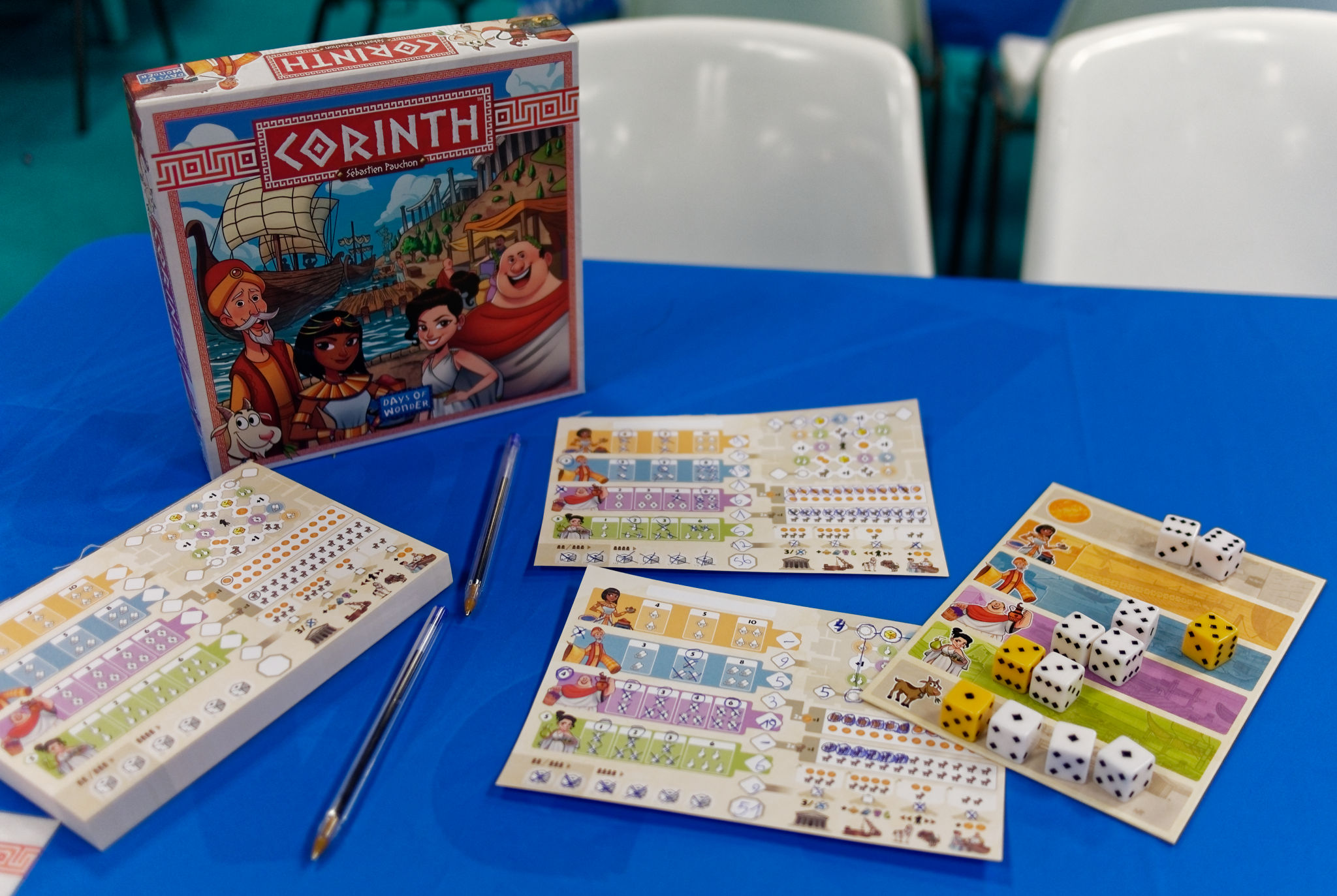 Chez Days of Wonder, le nouveau jeu Corinth est signé Sébastien Pauchon, l'auteur d'Yspahan (sorti en 2006 et plus disponible depuis bien longtemps). Et si je dis ça, c'est parce que Corinth est une sorte d'Yspahan modernisé à la sauce "roll & write". Si vous ne connaissez pas Yspahan, ce n'est pas bien grave. Ce qui est intéressant à savoir avec Corinth, c'est qu'il s'agit certes d'un jeu qui se joue en papier-crayon, mais qu'il offre malgré tout une richesse tactique que l'on pourrait retrouver sur un jeu de réflexion sur plateau. J'ai bien aimé ma partie de découverte de Corinth, parce que la "tour de dés" (qui existait déjà dans Yspahan) crée une grande richesse de choix à chaque tour de jeu, et qu'il y a plusieurs chemins stratégiques possibles que les joueurs peuvent emprunter au cours de la partie. J'ai par exemple perdu ma partie de découverte contre Carine, mais je ne peux pas l'imputer au tirage des dés mais bien aux erreurs de choix stratégiques que j'ai faites en début et milieu de partie. |